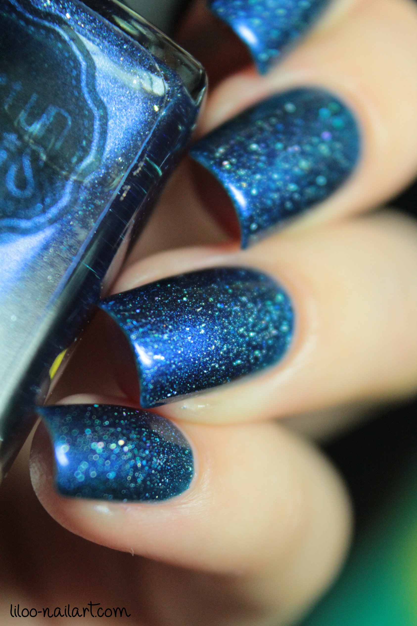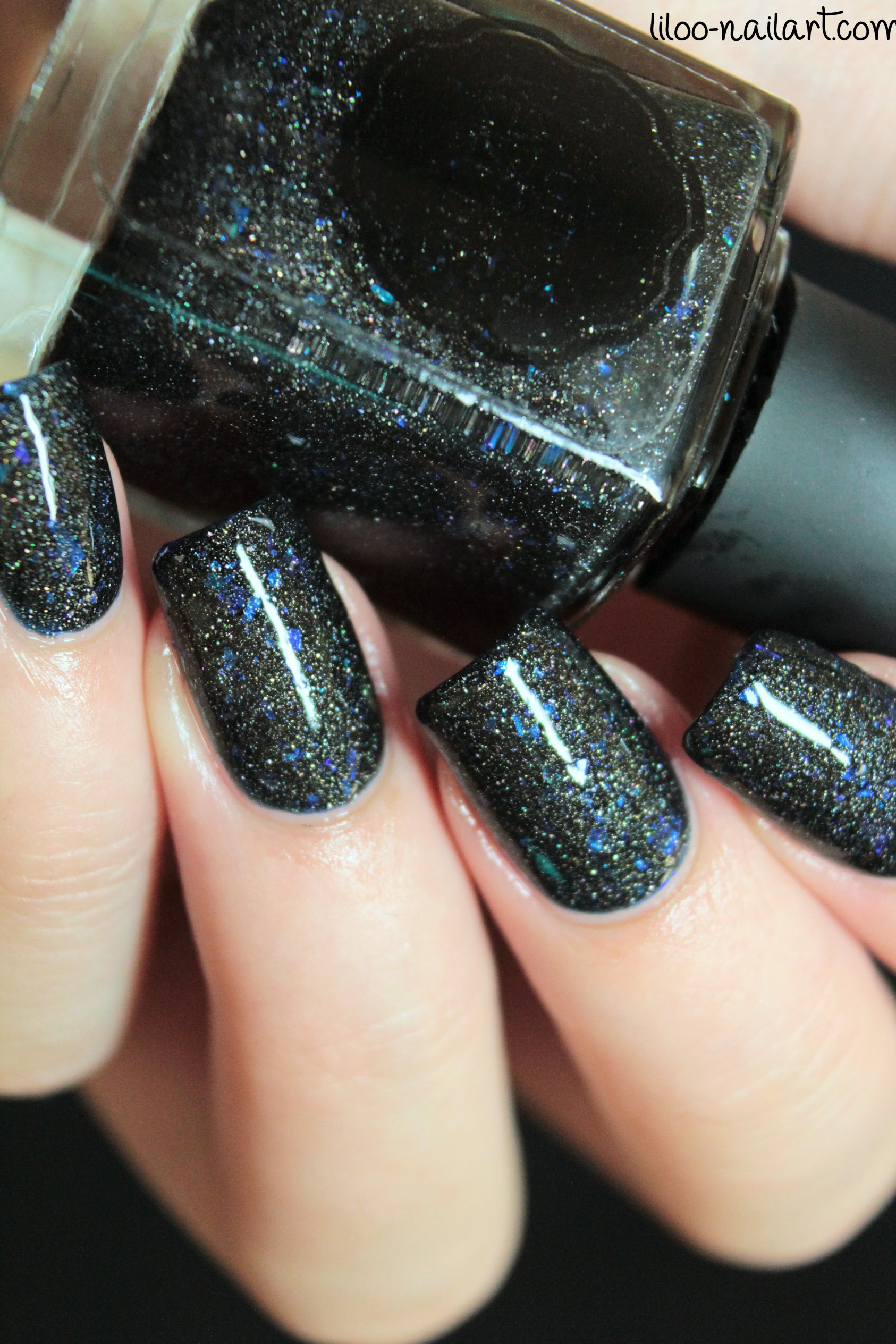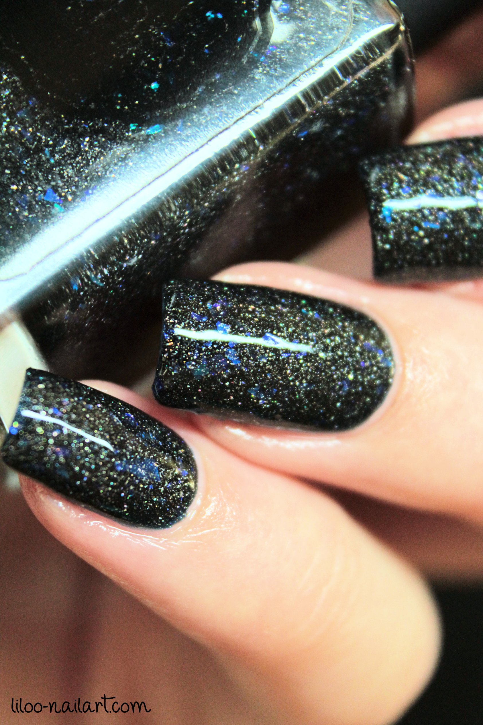 Le vernis contient des éclats de paillettes, l’effet est sympa mais cela peut apporter un côté rugueux lorsque le vernis est sec donc ne pas hésiter à mettre une voire deux couches de top coat!